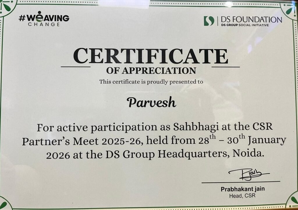 Parvesh was honoured as Sahbhagi at the CSR Partner’s Meet 2026 at the DS Group Headquarters, Noida.